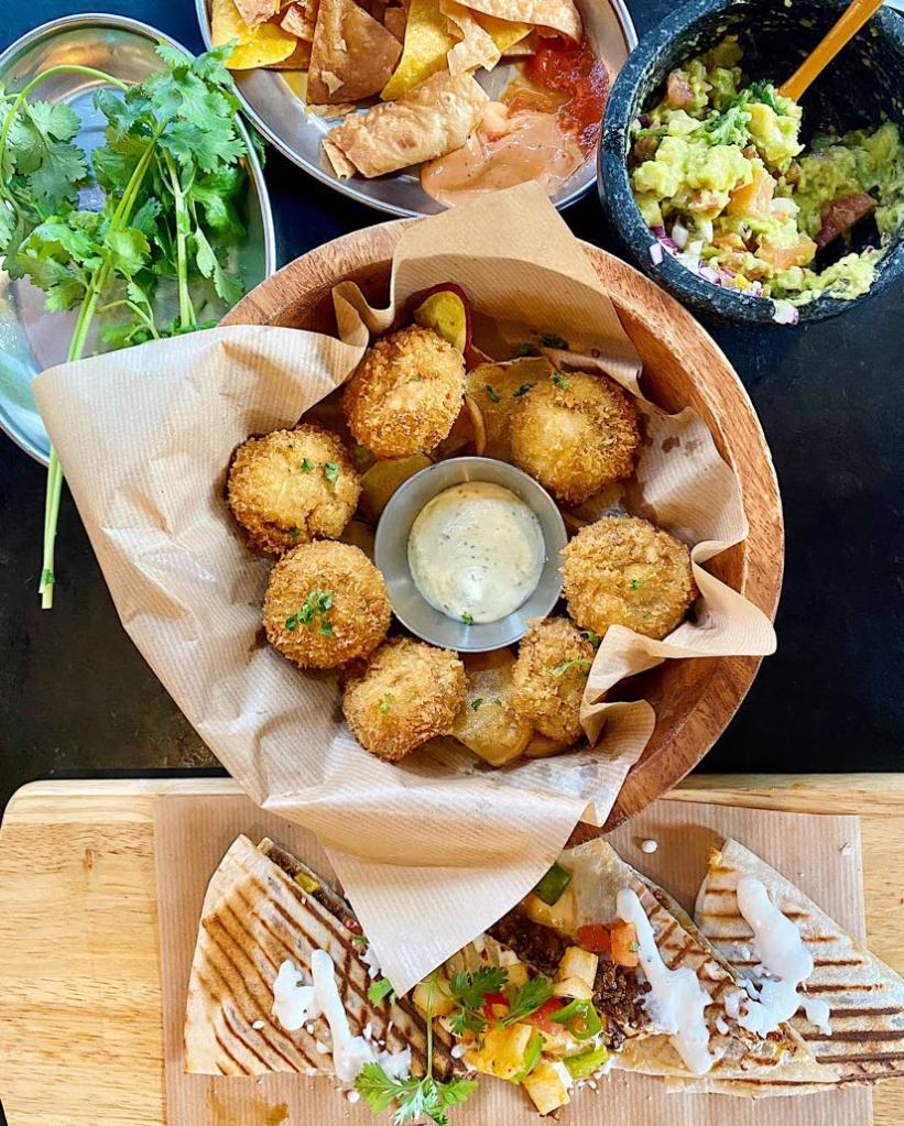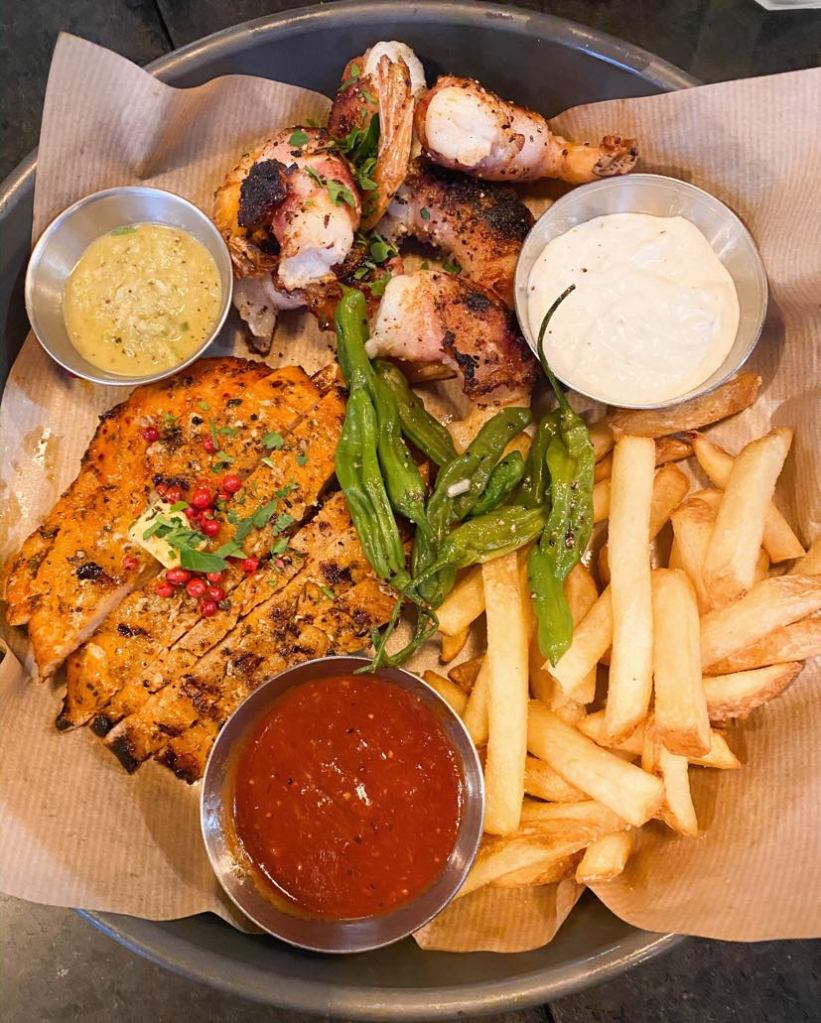 Or if you’re looking for something with a little more substance, the Surf & Turf Platter is where it’s at. Sometimes a taco just isn’t enough! This is where the Surf & Turf comes in. My friends and I ordered this one on a whim once, and we devoured it in about five minutes flat. It comes with grilled creole pork neck, bacon-covered grilled shrimp, french fries, and roasted shishito peppers. It’s also served with three sauces: a mojo sauce, ranch, and a sweet and tangy sauce. So. Dang. GOOD.
